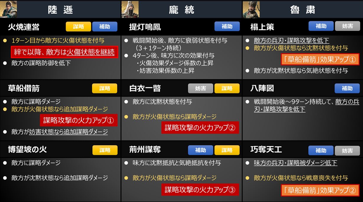 また、龐統の固有技は戦闘開始後から序盤戦、敵方を衰弱状態にできるので兵刃ダメージ系の部隊には有効ですが、NPCが使ってくる「舌戦群儒」(戦闘開始後、敵方に沈黙状態付与で6ターン持続)には相性が悪いです。提灯鳴鳳で敵方を衰弱状態とできても、戦闘開始時の妨害状態を付与は抑え込めないので、1ターン目から陸遜の火燃連営が発動しない可能性があります。また、荊州謀奪の妨害抵抗の効果は4ターン目以降となるので、今後この編成を育てていく上では留意しておく必要があります。