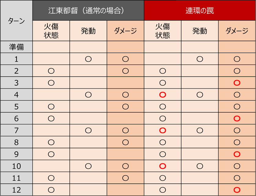 前項のタイミングの確認結果からもわかるように、連環の罠の絆により、陸遜の固有技によって、毎ターンでダメージ付与、2ターン目以降戦闘終了まで火傷状態とすることができることになります。このことにより、その影響度合いは次のようになります。
